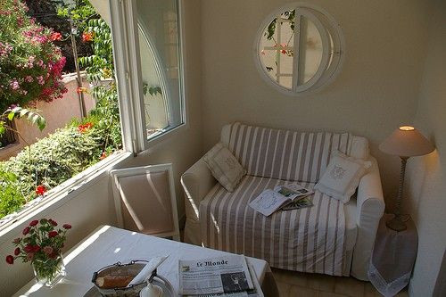 The entrance porch opens onto a spacious hallway from which all 8 rooms are accessed. The T3 Villa apt comprises of the first floor of a large independent 1920's Villa, with 10 ft ceilings, original shuttered windows, and south facing terrace with sea views. Villa la Ponote is a very unique property, decorated to a very high standard but with all modern conveniences. This 2 Bed Apartment is stylish and well furnished. It has a separate fully equipped fitted kitchen, a large spacious living room which opens onto separate dining room ( seating 4 persons comfortably ) which in turn opens onto the terrace with its 'apercu mer' , glimpse of the sea glistening awaiting you every morning. There are 2 spacious bedrooms, one a master bedroom , with king size bed , this bedroom also opens onto the terrace . The second bedroom has 2 single beds with a great view over the garden. There is a WC and a separate bathroom with shower and laundry facilities. The apartment is really well equipped with very convenient storage facilities in all the rooms. The terrace can accommodate comfortably 4 people dining and has a French day bed for relaxing in the sun. The terrace enjoys morning sunshine and is south facing , there is an overhead canopy which can be unrolled for shade. Downstairs in the courtyard is an outdoor shower which is very convenient for a refreshing shower and rinsing the sand from the beach.